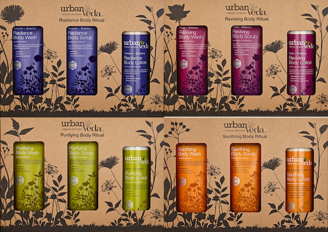 This Body Ritual Set by Urban Veda contains a body wash, a body scrub, and body lotions. There is a body ritual set from each of Urban Veda’s ranges: Purifying, Soothing, Radiance, and Reviving. Select a set depending on each individual’s skin type.