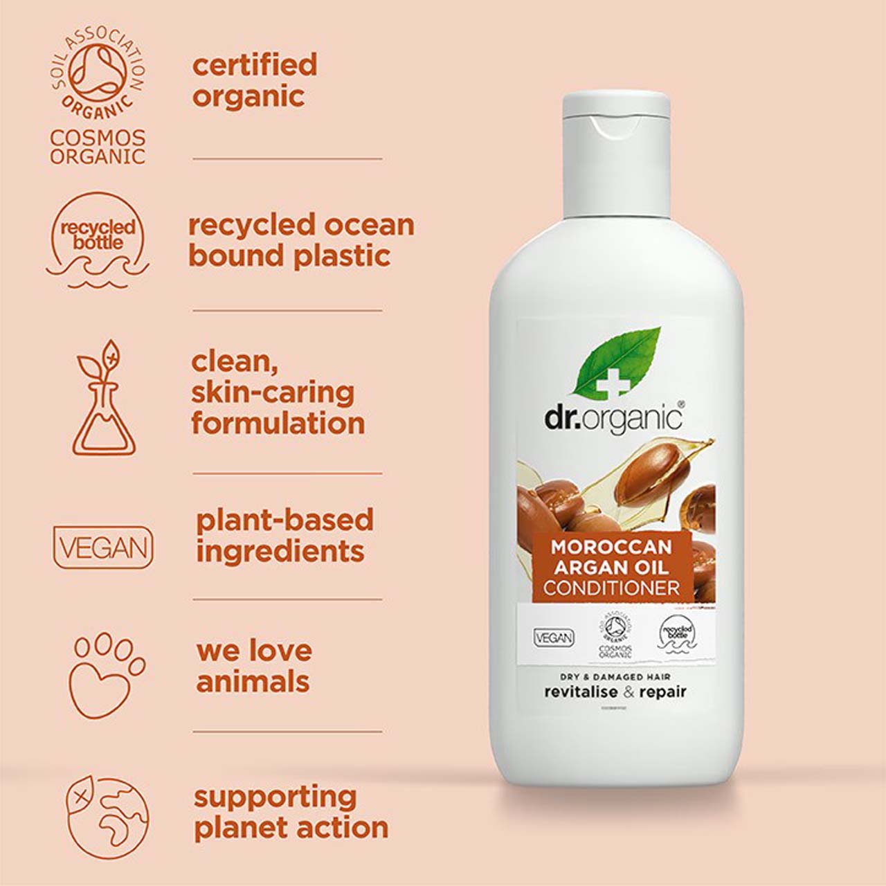 Smooth conditioner through wet hair, leave as desired and rinse. For best results use with Dr Organic Moroccan Argan Oil Shampoo.